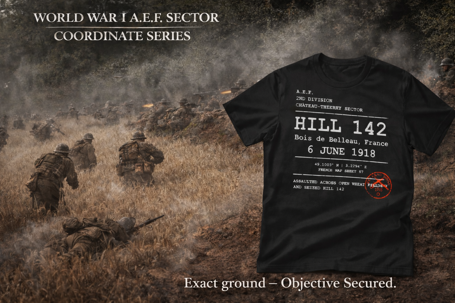 Before the name Belleau Wood became legend, the fight began on a rise of ground known only as Hill 142.From this height, German machine guns dominated the surrounding wheat fields and roads. As long as the hill remained in enemy hands, the advance toward the wood could not begin.The mission fell to the U.S. Marines of the 5th Regiment.At dawn they stepped off into the open.No cover.No concealment.Only waist-high wheat and a hillside alive with machine-gun fire.Men fell in rows as the Marines pushed forward through the field.Officers were hit.Units became tangled and scattered under the storm of bullets.Still they climbed.Across the slope and into the German trenches the fight became close and violent—rifles, bayonets, grenades, and bare hands in the churned earth.By afternoon the hill had been taken.Hill 142 was small ground on the map of France.But its capture opened the road to Belleau Wood, where the Marines would soon fight one of the most savage battles in their history.The first step toward that legend was taken here.On a hill that had to be seized.And was.
